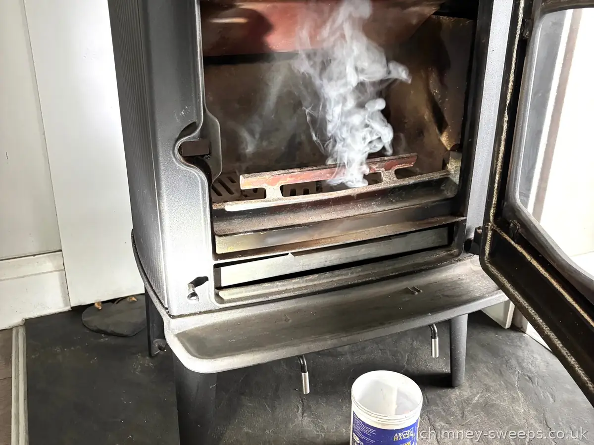 Wood burner chimney sweep in progress — vacuum hose in firebox, flexi rods and Arctic Hayes smoke cartridges ready for post-sweep draw test, Collier Row Romford.